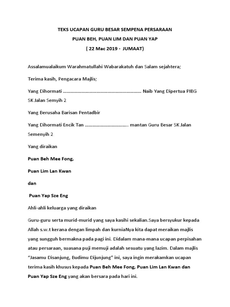 Puan beh, puan lim dan puan yap. Assalamualaikum warahmatullahiwabarakatuh / selamat petang selawat terima kasih saudara pengerusi majlis~ yang berbahagia tuan ppd perak tengah~ yang . Ucapan pengerusi kelab guru majlis persaraan. Teks ucapan guru besar sempena persaraan.